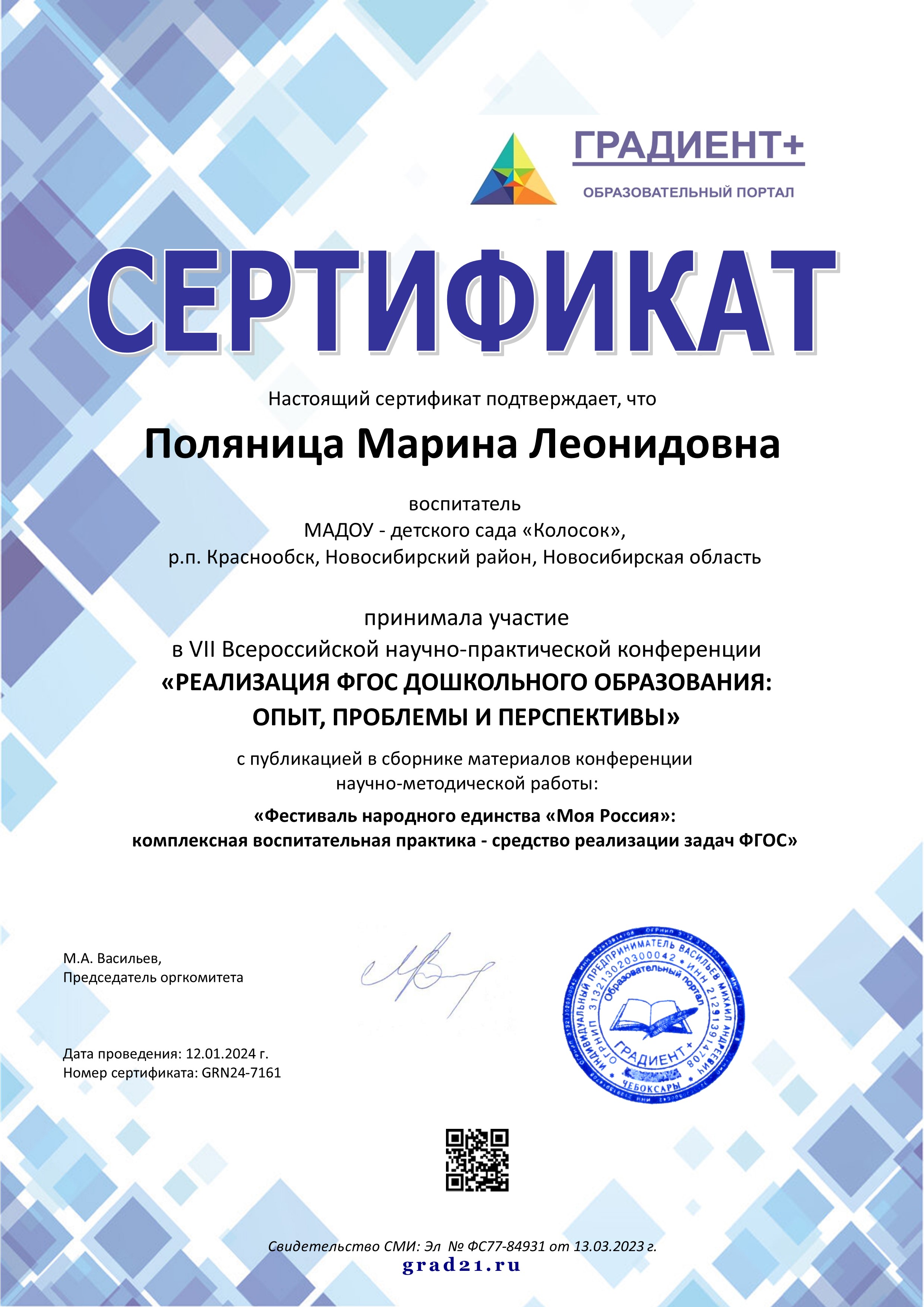 Сертификат участника VII Всероссийской научно-практической конференции, 2024