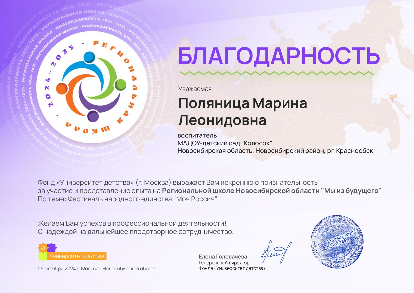 Благодарность за участие и представление опыта на Региональной школы Новосибирской области "Мы из будущего", 2024