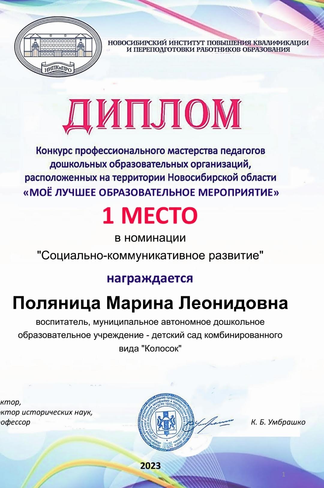 Диплом 1 место в конкурсе профессионального мастерства педагогов дошкольных образовательных организация "Моё лучшее образовательное мероприятие", 2023