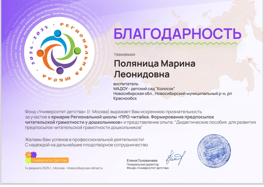 Благодарность за участие в ярмарке Региональной школы Новосибирской области "ПРО-читайка", 2025