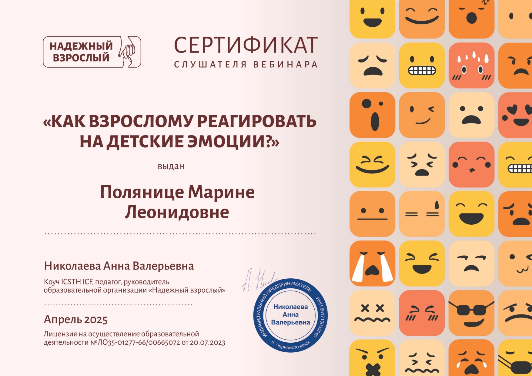 Сертификат слушателя вебинара "Как взрослому реагировать на детские эмоции", 2025